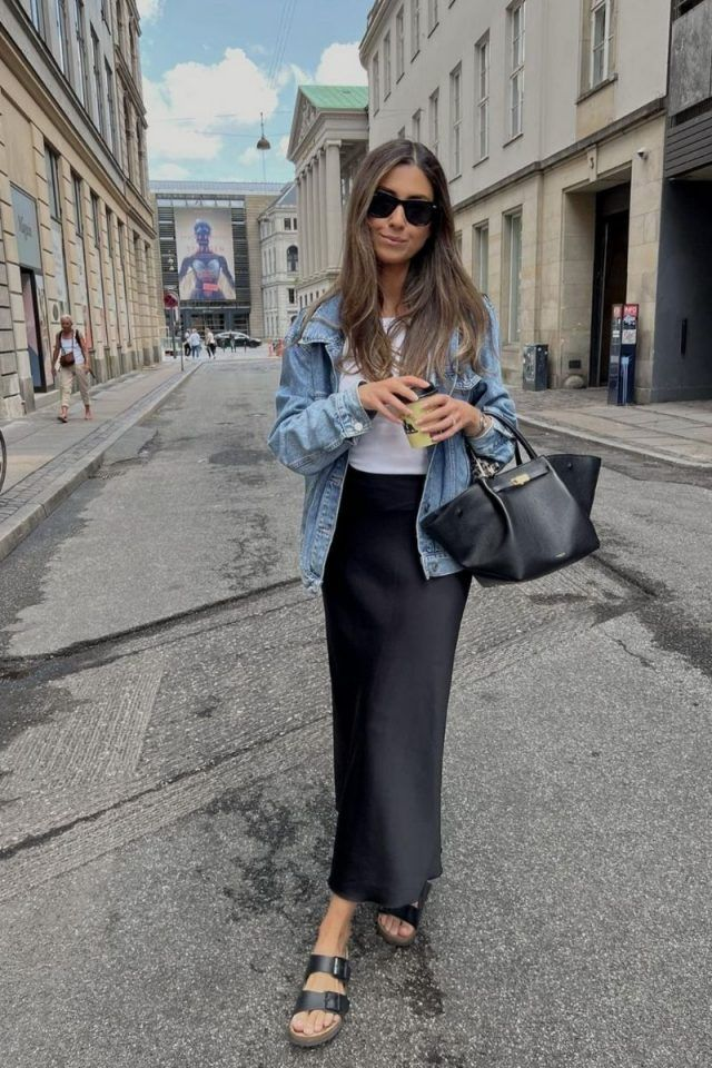 Slip skirts can read “evening.” A minimally detailed jacket (no heavy distressing) tones it down for day. Add low-profile sneakers or kitten heels, depending on your schedule.