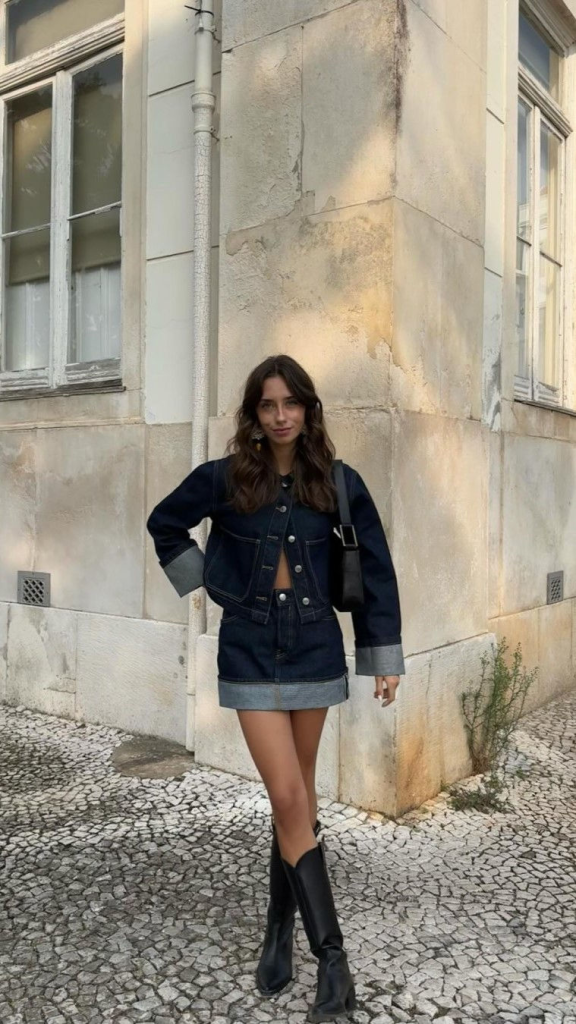 Coordinated but not cutesy. Dark indigo elevates; the mini keeps it fresh. Add sheer tights and Mary Janes for evening or knee boots for daytime polish.