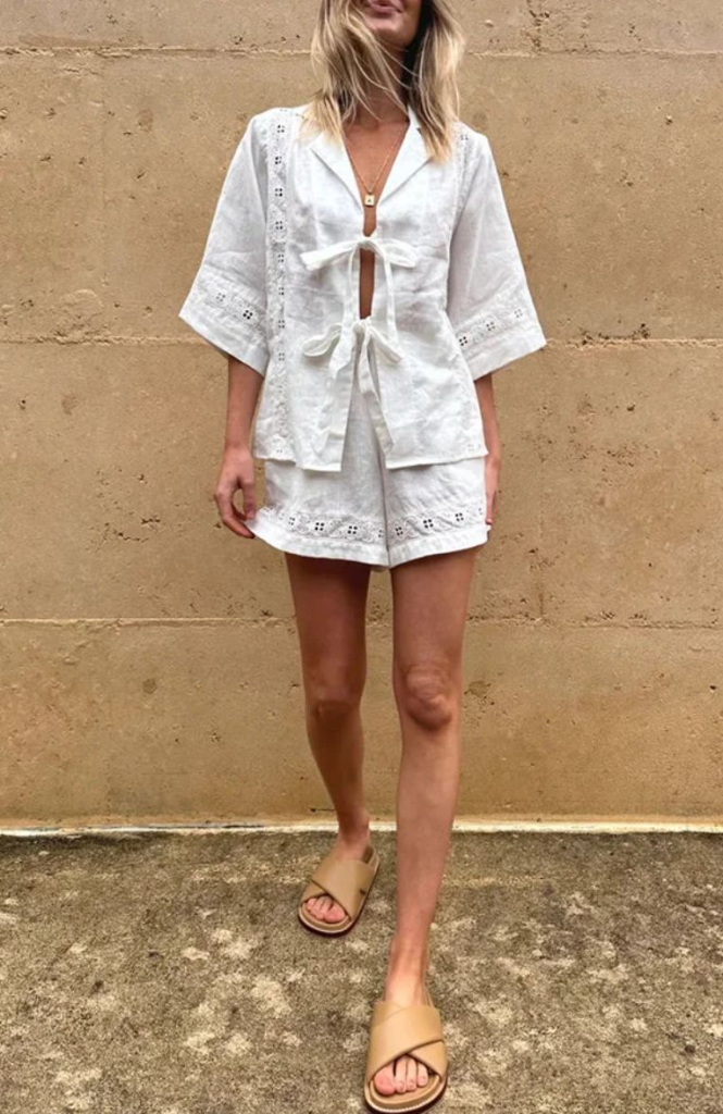 - Romantic blouse with puff sleeve: For dreamier vibes, brands like Dôen frequently offer organic cotton eyelet with considered details (puff sleeves, tie fronts) shopdoen.com.