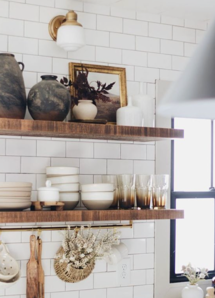 - Open shelves with everyday ceramics in soft whites, creams, and stoneware neutrals. Mix in a pitcher or two for height.